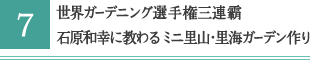 ガーデニンングコンテストの最高峰「英国チェルシーフラワーショー」で、里山の自然をテーマにした作品で金賞とベストガーデン賞をダブルで受賞した世界一の庭師 石原和幸さんに、誰でもできる自分だけのミニガーデン作りについて学びましょう。